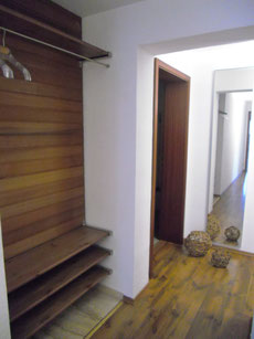 Diele mit Ganzkörperspiegel, Schuhregal und Garderobe mit Regenschirm.